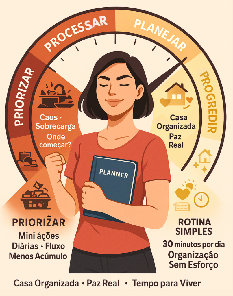A estrutura que organiza sua casa no piloto automático: Priorizar, Processar, Planejar e Progredir — tudo explicado de forma simples para você aplicar na mesma hora.